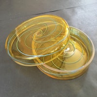 I only made two in this color combo so I’m selling them in a very special pair. the yellow is very glowy and transparent. the white dashes have a texture. each one measures approximately 3” tall and 3.25” wide. SOLD OUT