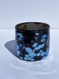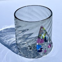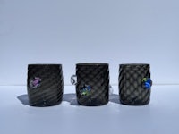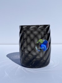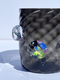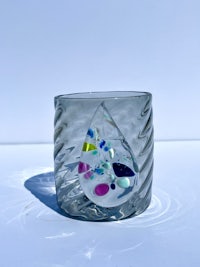 black translucent twisty cup adorned with a sparkly confetti ‘pebble.’ 3 available; 2 have one pebble and 1 is extra quirky and has three! approximately 4” tall and 3.25” wide. SOLD OUT