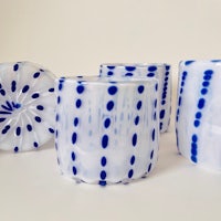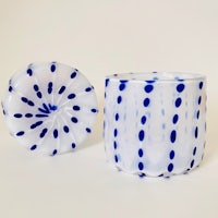 new for the holidays! a milky, translucent opaline white cup decorated with stripes of blue dots. the dot pattern turns out slightly different each time, making each one unique! measures approximately 3” tall and 3.25” wide.