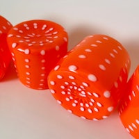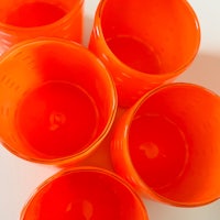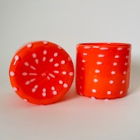 new for the holidays! a bright, opaque orange cup decorated with stripes of white dots. the dot pattern turns out slightly different each time, making each one unique! measures approximately 3” tall and 3.25” wide.