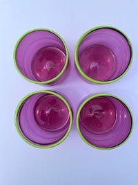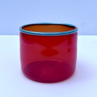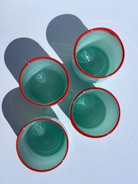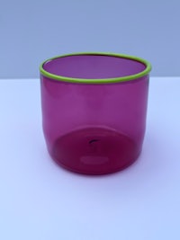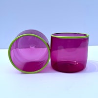 I love this new colorway! a transparent berry pink cocktail glass with a fun, gloopy chartreuse rim. approximately 3” tall and 3.25” wide. SOLD OUT